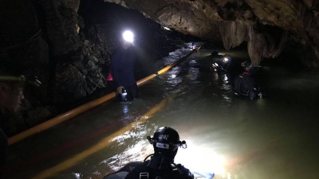Тайцы начали откачивать воду из пещеры рукавами диаметром в 15-30 сантиметров. Сначала откачивали по 5 кубов в минуту, потом по 40 кубов в минуту. Кроме того, спасатели попытались отвести воду из расположенного рядом водопада, чтобы она не попадала в пещеру. Они начали осушать источники и озера внизу, немного ниже этой пещеры, для того, чтобы воде из пещеры было куда идти.