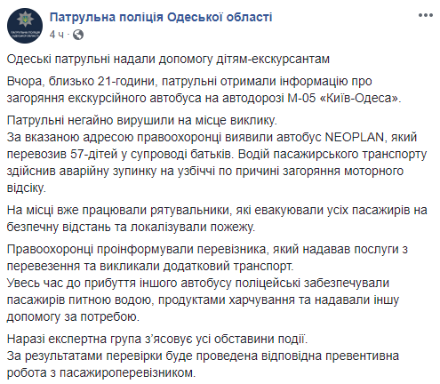 Автобус Neoplan, который перевозил 57 детей в сопровождении родителей, загорелся на трассе Киев – Одесса вечером в понедельник. Об это сообщает пресс-служба патрульной полиции Одесской области в Facebook.