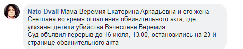 Также журналистка опубликовала фото из зала суда, на котором запечатлена мама и вдова Вячеслава Веремия во время оглашения обвинительного акта, где указаны детали убийства журналиста.