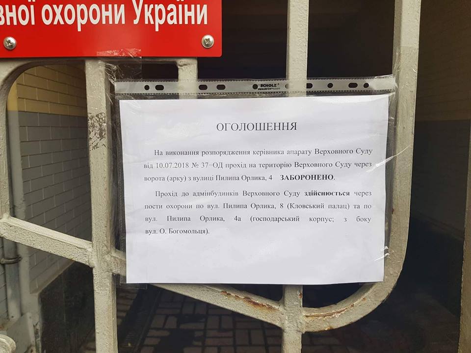 Сегодня, 11 июля, судьи Верховного суда не смогли попасть в здание через арку с улицы Филиппа Орлика. Такое решение было принято ликвидатором Верховного Суда Валентином Сердюком, о чем он уведомил коллег, разместив объявление на воротах.