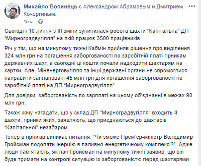 "На прошлой неделе Кабмин принял решение о выделении 324 млн грн на погашение задолженности по заработной плате горнякам государственных шахт, а сегодня эти средства начали поступать шахтерам на карточки. Но Минэнергоугля и другие государственные органы не смогли направить запланированные 45 млн грн для погашения задолженности по заработной плате на ГП "Мирноградуголь", - написал в соцсети Михаил Волынец.