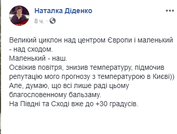 "Большой циклон над центром Европы и маленький - над востоком. Маленький - наш. Освежил воздух, снизил температуру, подмочил репутацию моего прогноза с температурой в Киеве," - написала она.