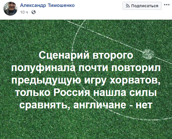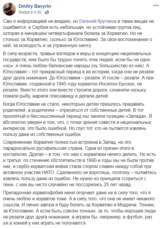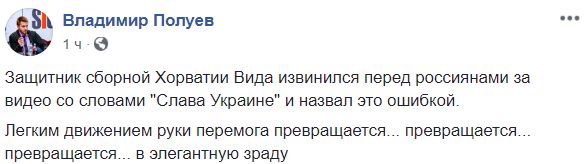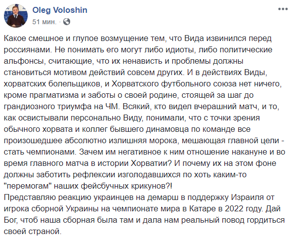 "Какое смешное и глупое возмущение тем, что Вида извинился перед россиянами. Не понимать его могут либо идиоты, либо политические альфонсы, считающие, что их ненависть и проблемы должны становиться мотивом действий совсем других. И в действиях Виды, хорватских болельщиков, и Хорватского футбольного союза нет ничего, кроме прагматизма и заботы о своей родине, стоящей за шаг до грандиозного триумфа на ЧМ.