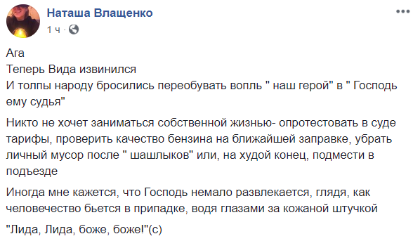 "Теперь Вида извинился. И толпы народу бросились переобувать вопль " наш герой" в " Господь ему судья"