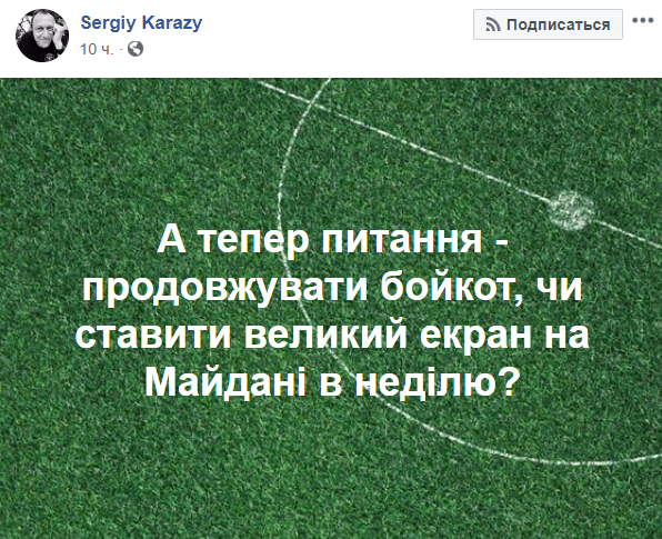 "А теперь вопрос - продолжать бойкот или ставить большой экран на Майдане в воскресенье?", - задается вопросом журналист Сергей Каразий.