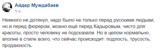 "Немного не дотянул, надо было не только перед русскими людьми, но и перед фюрером, можно ещё перед Кадыровым, чисто для красоты, просто человеку не подсказали. Но в целом нормально, вполне в стиле всего, что сейчас происходит: подлость, трусость, продажность".