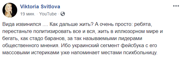 "Вида извинился .... Как дальше жить? А очень просто: ребята, перестаньте политизировать все и вся, жить в иллюзорном мире и бегать, как стадо баранов, за так называемыми лидерами общественного мнения. Ибо украинский сегмент фейсбука с его массовыми истериками уже напоминает местами психбольницу", - пишет журналистка Виктория Светлова.
