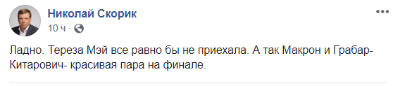 "Тереза Мэй все равно бы не приехала. А так Макрон и Грабар-Китарович- красивая пара на финале".
