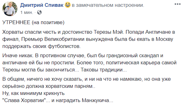 А одесский депутат Дмитрий Спивак считает, что хорваты спасли честь и достоинство Терезы Мэй.
