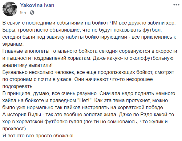 "В связи с последними событиями на бойкот ЧМ все дружно забили х...р.