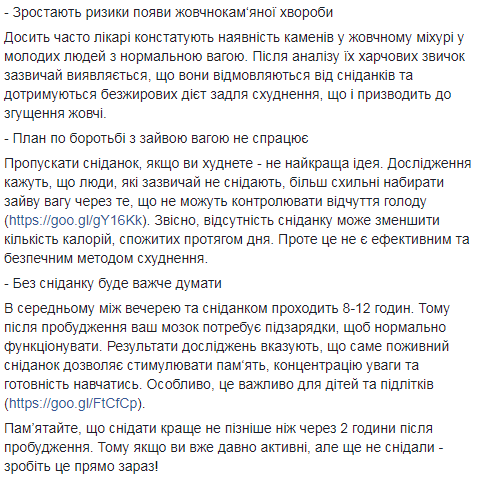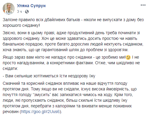 И.о. министра здравоохранения Украины Ульяна Супрун рассказала гражданам Украины о пользе завтраков. Утренний прием пищи помогает победить желание есть нездоровую пищу и снижает риски появления желчнокаменной болезни.