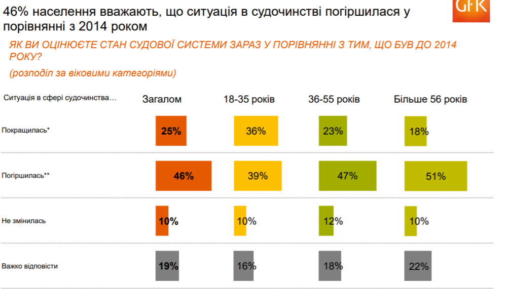 Также 46% считают, что ситуация с судопроизводством в стране ухудшилась с 2014 года.