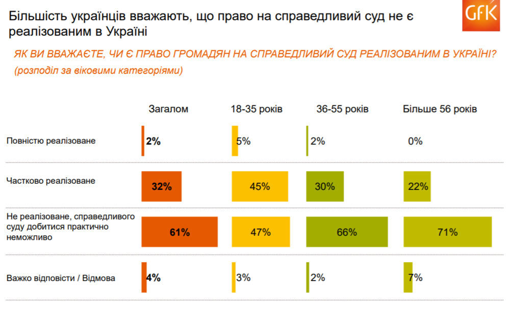 Также большинство опрошенных - 61% - считают, что в Украине не реализовано право на справедливый суд.
