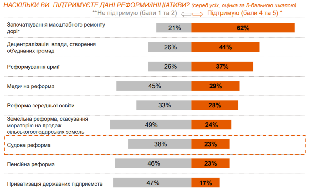 Украинцы крайне низко оценивают судебную реформу, которая проводится в стране. По данным GFK Ukraine, уровень ее поддержки равен 23% опрошенных.