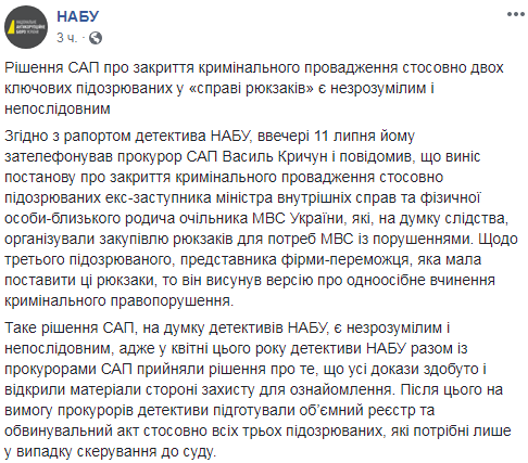 "Относительно третьего подозреваемого (Литвина - Прим.Ред.), представителя фирмы-победителя, которая должна была поставить эти рюкзаки, то он выдвинул версию о единоличном совершении уголовного правонарушения", – отметили в НАБУ.