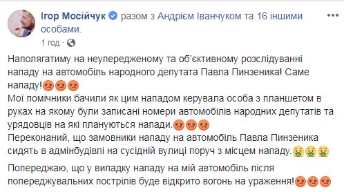 Депутат-радикал Игорь Мосийчук опубликовал несколько фото инцидента и пообещал, что в случае, если подобное случится с его автомобилем, будет «открывать огонь на поражение».