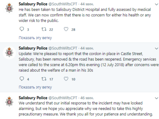 "Сейчас мы имеем дело с инцидентом на Касл стрит, Солсбери, касающемся мужчины в возрасте порядка 30 лет. Учитывая текущие инциденты в Солсбери и Эймсбери, мы предпринимаем очень высокие меры предосторожности, чтобы обеспечить безопасность населения", - говорится в сообщении полиции в Twitter.