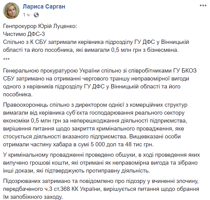 Пресс-секретарь генпрокурора Лариса Сарган добавила, что сотрудник ГФС вместе с директором одной из фирм требовали от руководителя завода взятку за решение вопроса о закрытии уголовного производства.