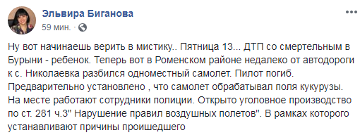 Глава пресс-службы Нацполиции области Эльвира Биганова в Facebook подтвердила, что в Роменском районе, недалеко от автодороги в села Николаевка, разбился одноместный самолет. Пилот погиб.