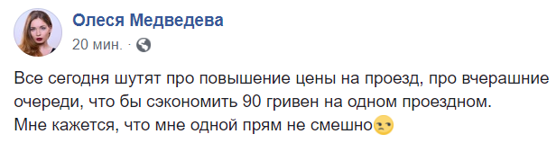 "Все сегодня шутят про повышение цены на проезд, про вчерашние очереди, что бы сэкономить 90 гривен на одном проездном. Мне кажется, что мне одной прям не смешно", - журналистка Олеся Медведева.