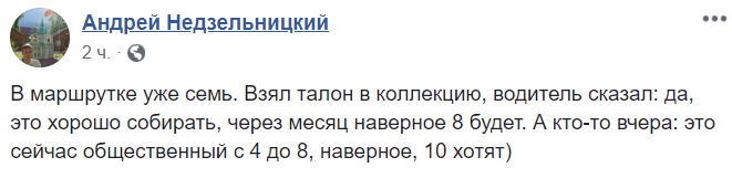 "В маршрутке уже семь. Взял талон в коллекцию, водитель сказал: да, это хорошо собирать, через месяц наверное 8 будет. А кто-то вчера: это сейчас общественный с 4 до 8, наверное, 10 хотят", - пишет киевлянин Андрей Недзельницкий.