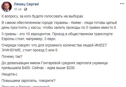 Почему так? До девальвации имени Гонтаревой средняя зарплата украинца превышала $400. Сейчас - едва выше $200. Нищета-с. Повышаем зарплаты, говорите? Пришли в Европу, говорите?" - пишет журналист и блогер Сергей Лямец.