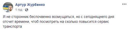 "Я не сторонник беспочвенно возмущаться, но с сегоднящнего дня отсчет времени, чтоб посмотреть на сколько повысится сервис транспорта", - пишет Артур Журбенко.