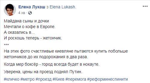На этих фото счастливые киевляне пытаются купить побольше жетончиков до их подорожания в два раза. Когда мэр боксёр - город всегда будет в нокауте. Уверена, цены на проезд поднял Путин", - написала политик Елена Лукаш.