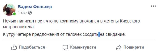 "Ночью написал пост, что по крупному вложился в жетоны Киевского метрополитена. К утру четыре предложения от телочек сходить на свидание", - пошутил журналист Вадим Фолькер. А может, и не пошутил.