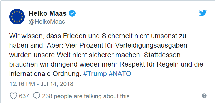 "Мы знаем, что мир и безопасность не даются просто так. Но четыре процента расходов на оборону не сделают наш мир более безопасным. Вместо этого нам необходимо проявлять больше уважения к правилам и международному порядку", - написал Маас в Twitter.