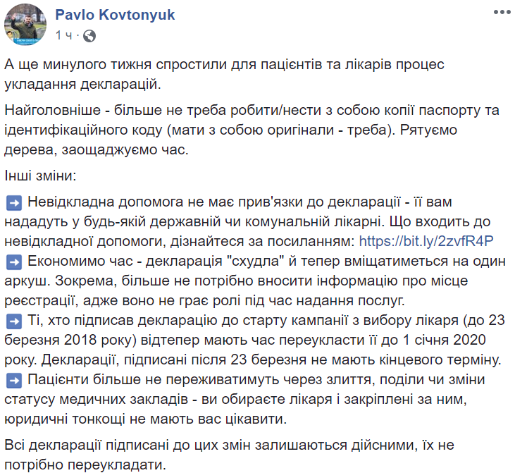 - те, кто подписал декларацию до старта кампании по выбору врача (до 23 марта 2018) отныне имеют время перезаключить ее до 1 января 2020 года. Декларации, подписанные после 23 марта, не имеют конечного срока;
