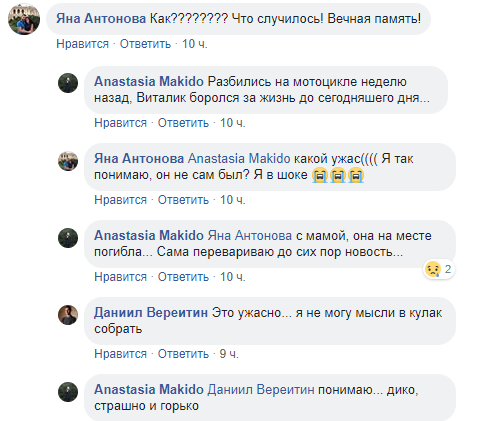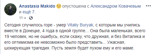 "4 года в одной группе. Она была маленькая, всего 19 человек, но не ошибусь, если скажу, что дружная, и без Виталика и его оптимизма ее невозможно было представить. Ужасная, шокирующая трагедия. Пусть земля будет пухом ему и его маме", - отметила она.