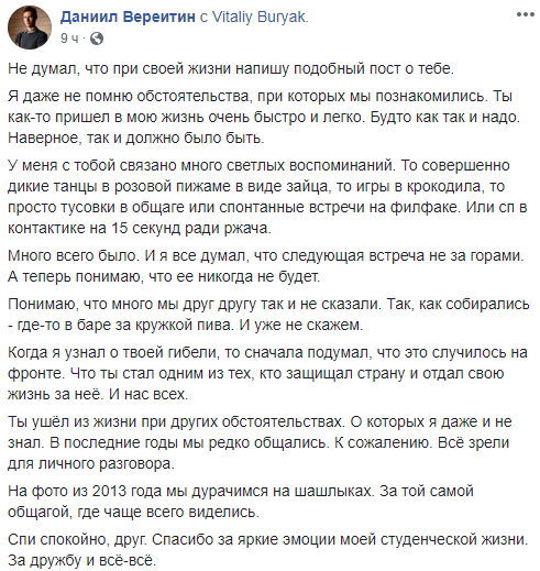 Ты ушел из жизни при других обстоятельствах. О которых я даже и не знал. В последние годы мы редко общались. К сожалению. Все зрели для личного разговора...Спи спокойно, друг. Спасибо за яркие эмоции моей студенческой жизни. За дружбу и все-все", - написал он пост в Facebook.
