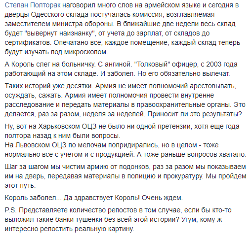 Советник министра обороны Юрий Бирюков в Facebook отметил, что глава 46-го Объединенного центра обеспечения Евгений Король ушел на больничный.