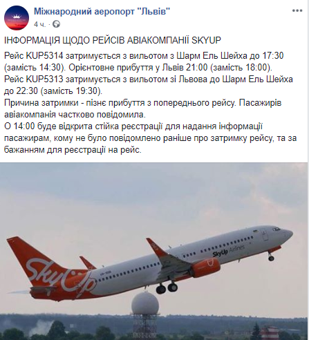 "Рейс KUP5314 задерживается с вылетом из Шарм-эль-Шейха до 17:30 (вместо 14:30). Ориентировочное прибытие во Львов - 21:00 (вместо 18:00). Рейс KUP5313 задерживается с вылетом из Львова в Шарм-эль-Шейха до 22:30 (вместо 19:30)".