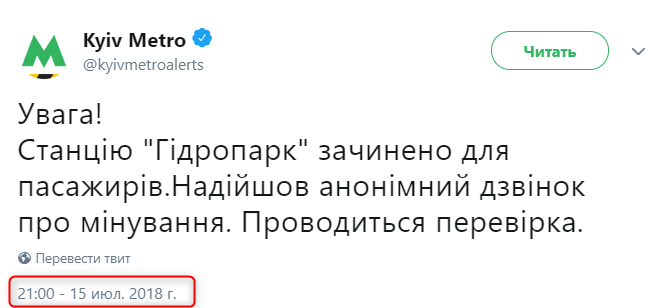 Также появилась информация о закрытии станции метро "Левобережная"(соседняя с "Гидропарком"). Около 8.30 поступил анонимный звонок о минировании. Проводится проверка. Об этом сообщает "Киев Оперативный".