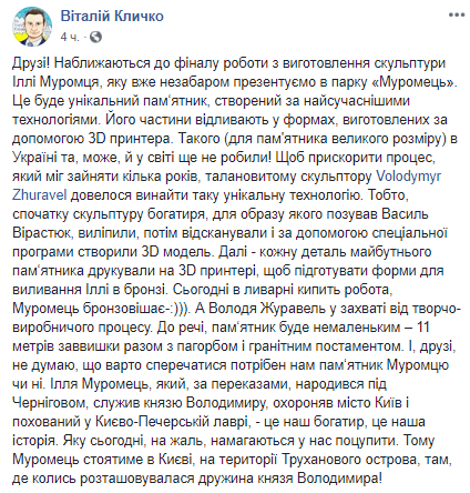 "Илья Муромец, который, по преданию, родился под Черниговом, служил князю Владимиру, охранял город Киев и похоронен в Киево-Печерской лавре, - это наш богатырь, это наша история. Которую сегодня, к сожалению, пытаются у нас украсть. Поэтому Муромец будет стоять в Киеве, на территории Труханова острова, там, где когда-то располагалась жена князя Владимира!", - заявил Кличко.
