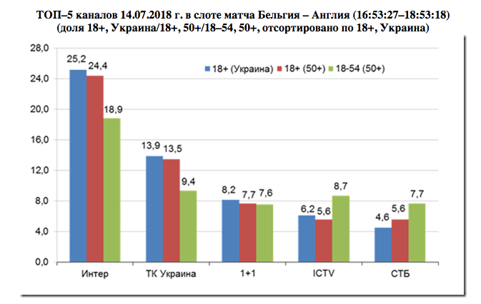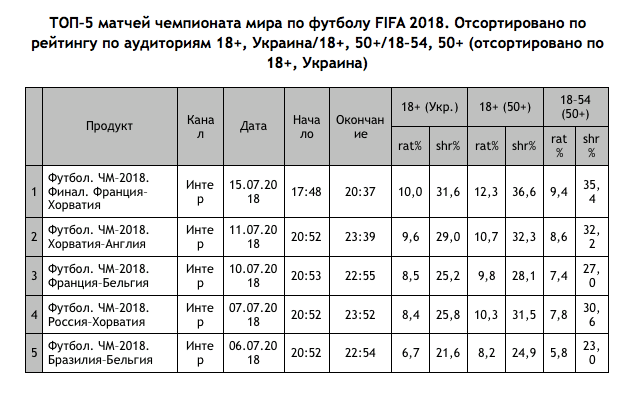 При этом финальный матч между Францией и Хорватией стал наиболее рейтинговым  - его посмотрели 6,7 миллионов зрителей. Его доля среди зрителей 18+ в Украине в соответствующем слоте составила 31,6%, в городах с населением более 50 тыс. – 36,6%. По аудитории 18-54 лет в крупных городах доля матча была 35,4%.