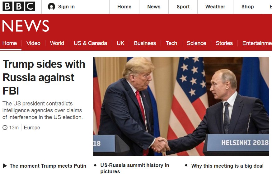Не отстает и британская пресса. Государственная "БиБиСи" пишет, что "Трамп встал на сторону России против ФБР", намекая также на некое подобие госизмены.