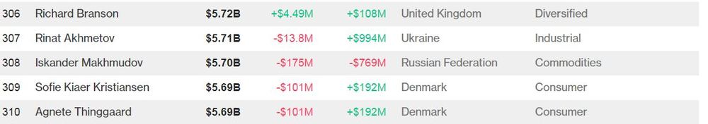 Олигарх Ринат Ахметов с состоянием в 5,71 миллиарда долларов стал единственным украинцем, который попал в топ-500 миллиардеров мира по версии Bloomberg.Об этом свидетельствуют данные Bloomberg Billionaires Index.