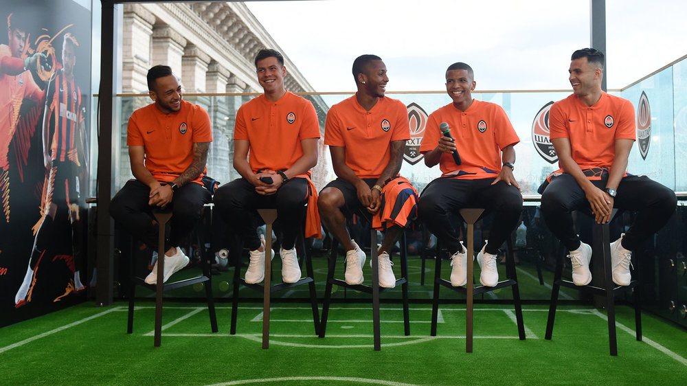 На террасе столичного ЦУМа донецкий "Шахтёр" представил пятерку новых футболистов, которые перешли в состав чемпионов Украины в летнее межсезонье.