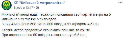 В пресс-службе метрополитена сообщили, что в прошлую пятницу пассажиры пополнили свои карточки метро на 5 971,525 тыс. поездок, из которых 4568,8 тыс. поездок по тарифу 4,5 грн.