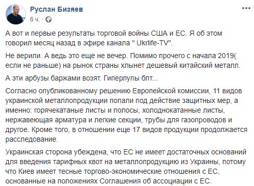Политолог Руслан Бизяев предупреждает, что это еще не все: "А вот и первые результаты торговой войны США и ЕС. Я об этом говорил месяц назад.