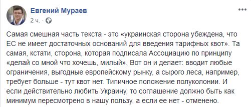 На эту новость отреагировали украинские блогеры. В частности, народный депутат Евгений Мураев пишет: "Самая смешная часть текста - это "украинская сторона убеждена, что ЕС не имеет достаточных оснований для введения тарифных квот". Та самая, кстати, сторона, которая подписала Ассоциацию по принципу "делай со мной что хочешь, милый". Вот он и делает: вводит любые ограничения, выгодные европейскому рынку, а сырого леса, например, требует больше - тут квот нет. Типичное положение полуколонии. И если действительно любить Украину, то соглашение должно быть как минимум пересмотрено в нашу пользу, а если ее нет - отменено".