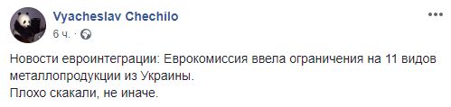 Вячеслав Чечило иронизирует: "Новости евроинтеграции: Еврокомиссия ввела ограничения на 11 видов металлопродукции из Украины. Плохо скакали, не иначе".