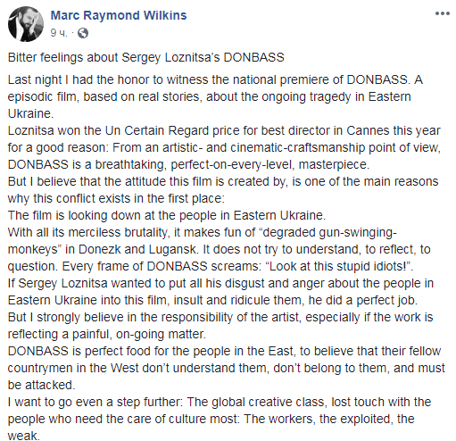 "Со всей своей беспощадной жестокостью он высмеивает "деградировавших обезьян с гранатами" в Донецке и Луганске. Он не пытается понять, задуматься, подвергнуть сомнению. Каждый кадр фильма Донбасс кричит "Посмотрите на этих глупых идиотов!", пишет у себя в Facebook режиссер режиссер Марк Рэймонд Уилкинс, который был горд оказанной ему честью побывать на национальной премьере нашумевшего фильма.