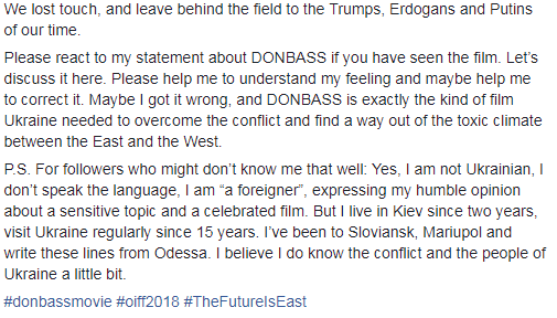 "Я твердо верю в ответственность художника, особенно если его работа отражает болезненное темы. Donbass - идеальный пища для ума людей на Востоке, чтобы они поверили, что их соотечественники на Западе не понимают их, не принадлежат им и должны быть атакованы. Я хочу пойти еще дальше: глобальный творческий класс, потерял связь с людьми, которым больше всего нужна забота о культуре: рабочими, эксплуатируемыми, слабыми. Мы потеряли связь с ними и оставили место для Трампов, Эрдоганов и Путиным нашего времени", заключает режиссер.