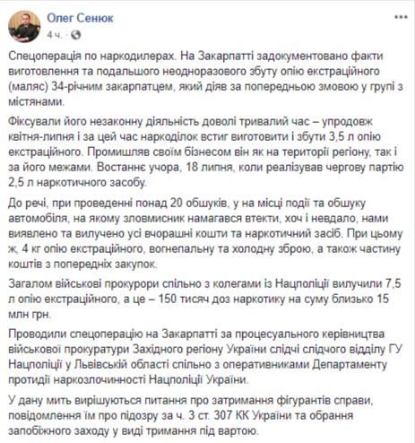 "Фиксировали его незаконную деятельность на протяжении апреля-июля и за это время наркодилер успел изготовить и сбыть 3,5 литра экстракционного опия. Промышлял своим бизнесом он как на территории региона, так и за его границами", - написал Сенюк на своей странице в соцсети Facebook.