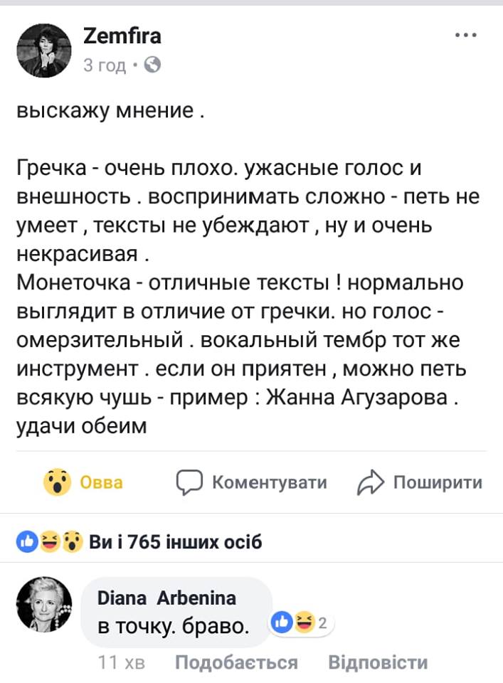 "Гречка — очень плохо. Ужасные голос и внешность. Воспринимать сложно — петь не умеет, тексты не убеждают, ну и очень некрасивая", — написала Земфира.