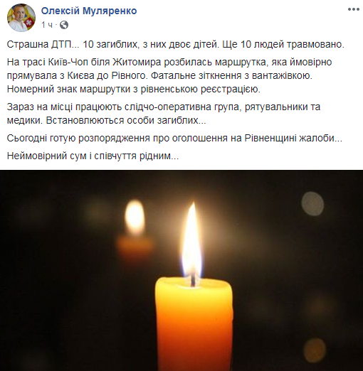 Глава Ровенской ОГА Алексей Муляренко сообщил в Facebook о подписании распоряжения о трехдневном трауре в регионе.